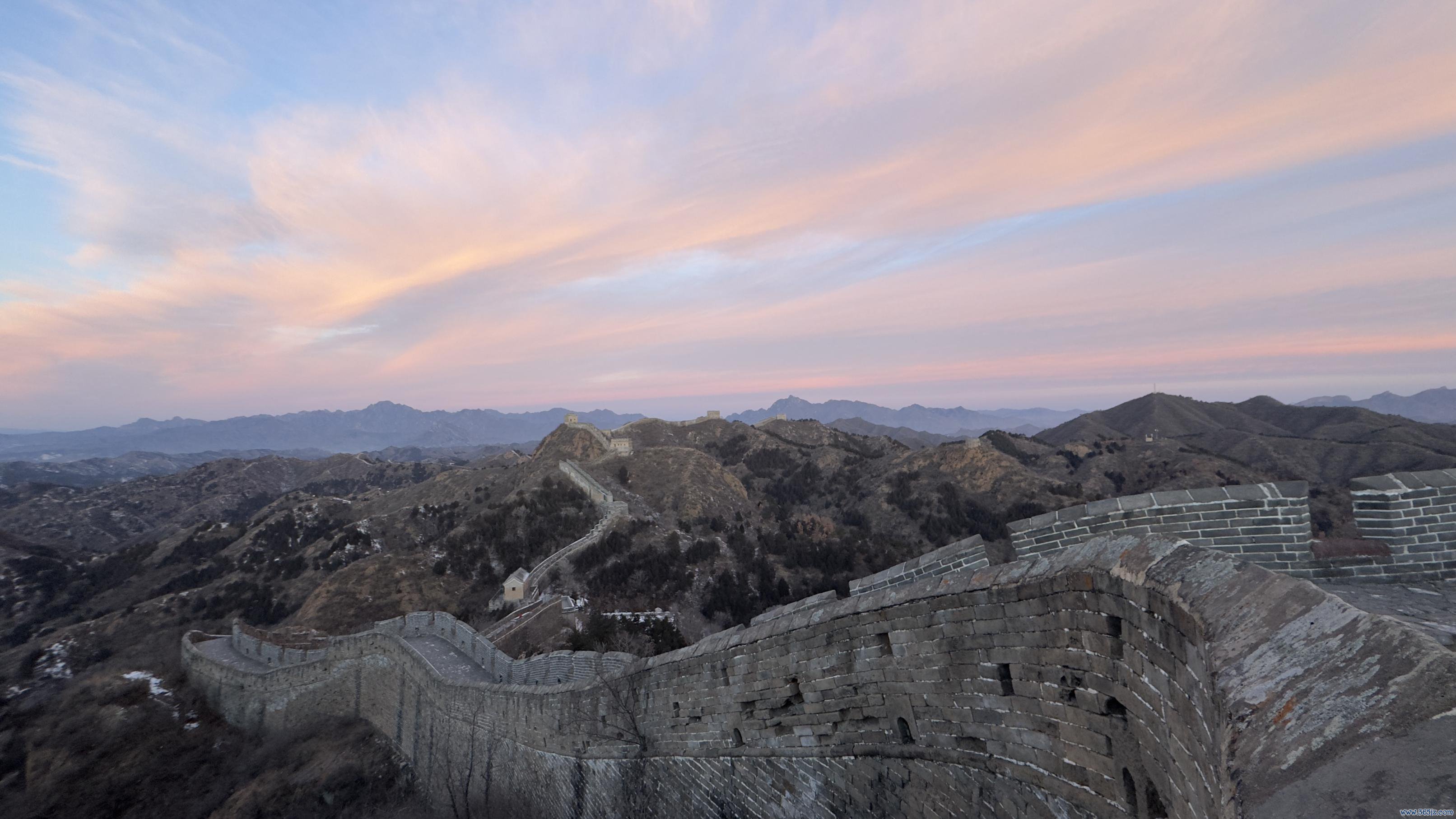 河北滦平:雪后早晨,金山岳长城早霞美丽瞩目